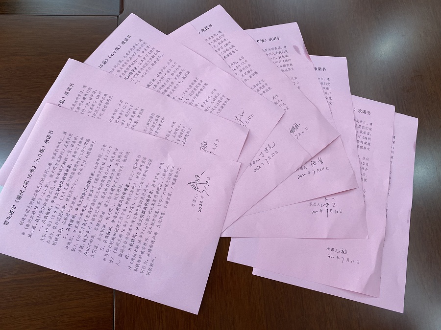 揚(yáng)子集團(tuán)黨員干部及全體職工利用微信工作群認(rèn)真學(xué)習(xí)《滁州文明16條(2.0版)》)并簽訂了《帶頭遵守〈滁州文明16條〉(2.0版)承諾書》,爭做模范遵守、帶頭踐行的表率,從自身做起,講文明、樹新風(fēng),積極勸導(dǎo)不文明行為,號(hào)召更多人養(yǎng)成健康科學(xué)的生活習(xí)慣,展現(xiàn)新時(shí)代精神面貌,為推進(jìn)全國文明城市創(chuàng)建、培育文明新風(fēng)尚貢獻(xiàn)力量。